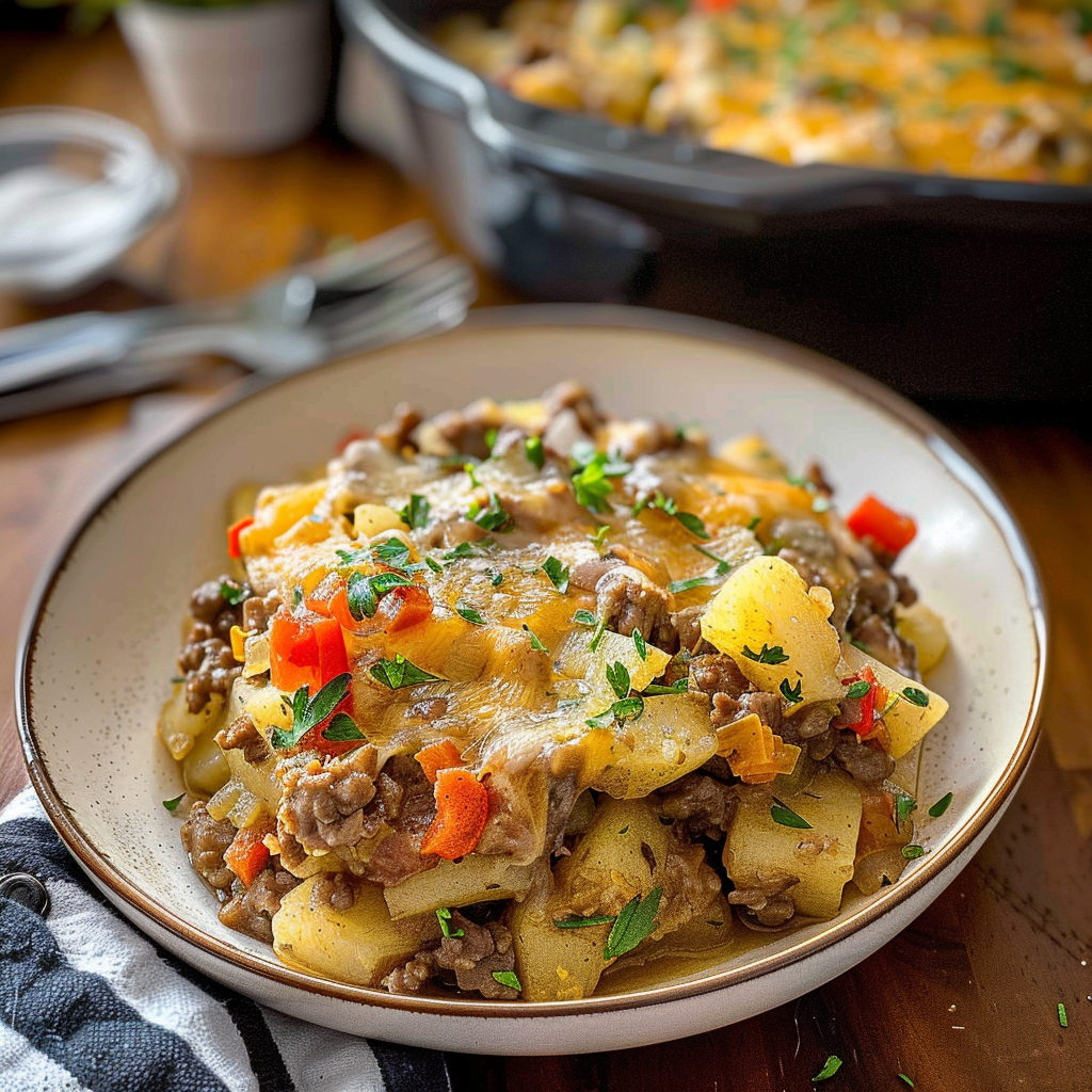 The aroma of tender beef mingling with savory cheese and creamy potatoes will make your mouth water the moment you