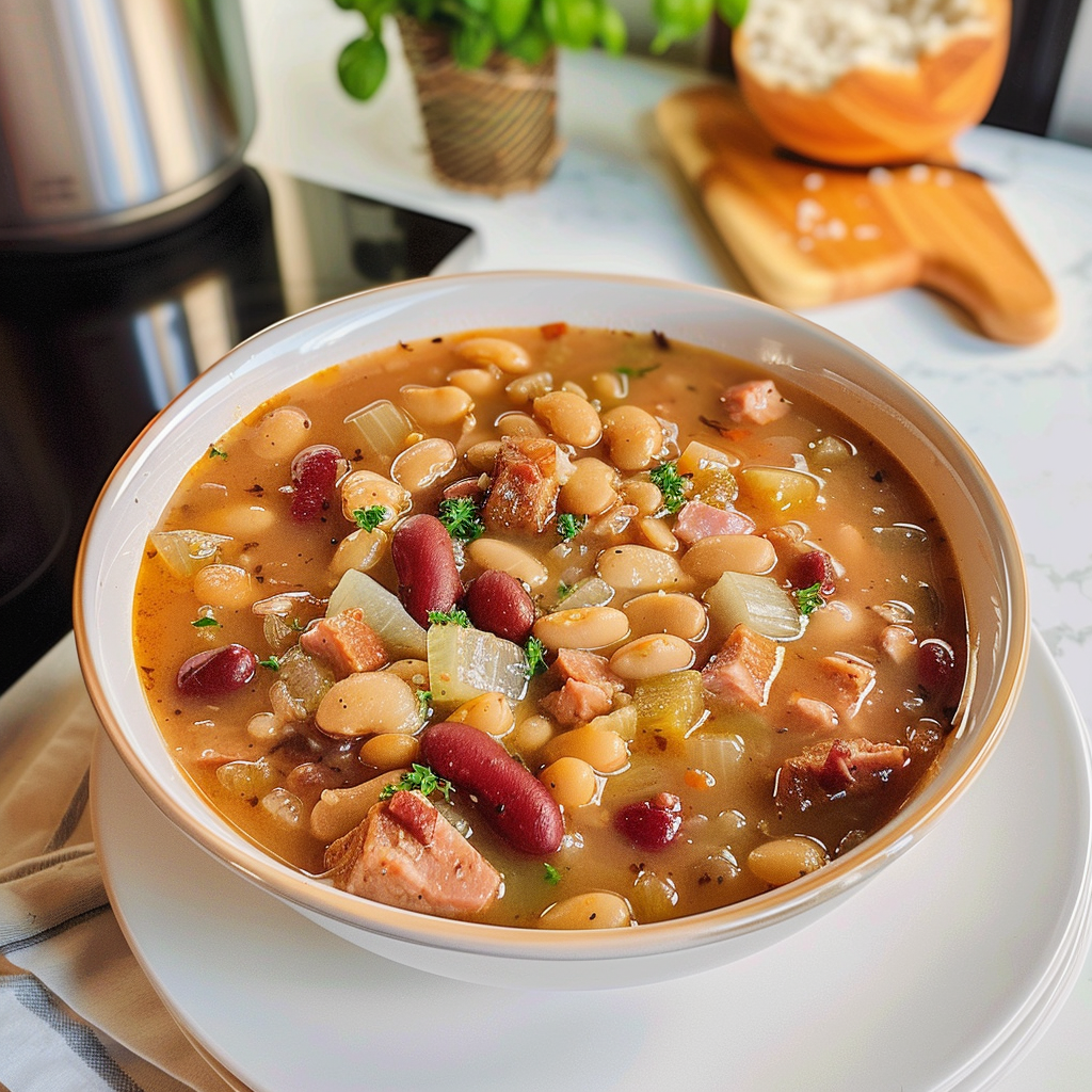 There’s something magical about Crockpot Ham & Bean Soup. Picture a bubbling pot of savory goodness, with tender beans absorbing
