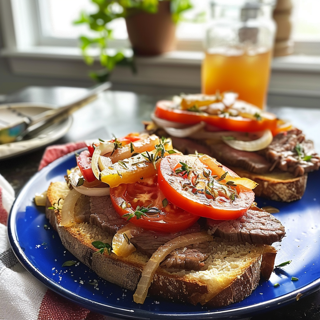 Steak, Tomato and Sweet Onion Open Sandwiches are the kind of dish that makes your mouth water just thinking about